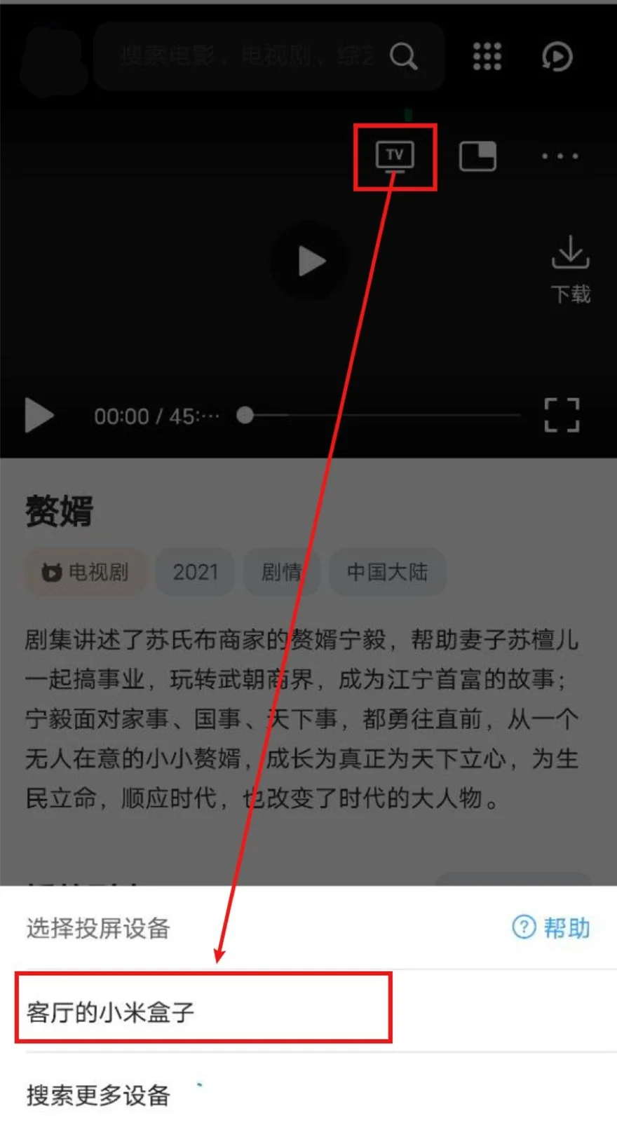 打开QQ浏览器(会接管网页播放器)->打开新世界影视免费电影电视剧->播放视频->选中投屏图标->等待搜寻出智能电视/电视盒子->选中,即可投屏。